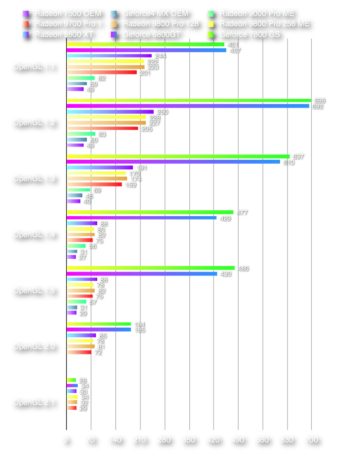 OpenGL Viewer reports for other cards mirrored the improvement of OpenGL supported versions in OS X 10.5, as compared to earlier OS versions.